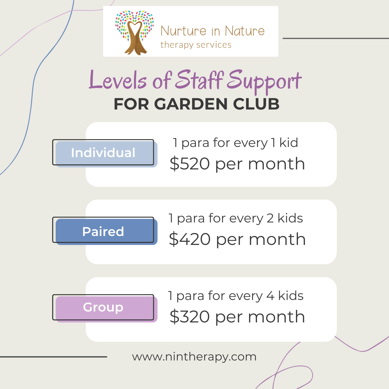 We have 3 different levels of staff support to choose from, ranging from 1:4 to 1:1.